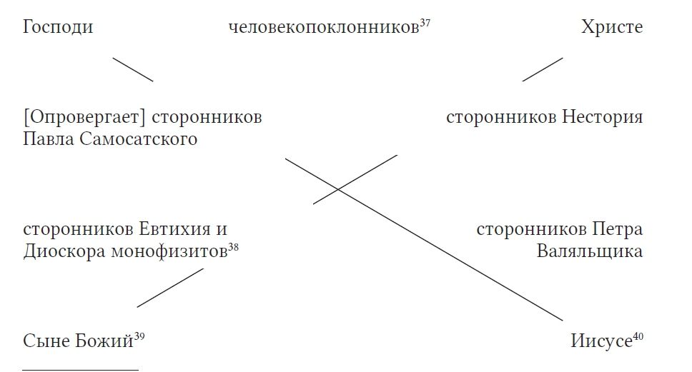 2. Однако можно увидеть, что эти божественные молитвенные речения являют также и наше благочестивое учение и как бы отгоняют всякую злославную ересь. Так как божественная природа [Богочеловека] обнаруживается [словом] «Господи», отвергаются считающие Иисуса простым человеком. [Словом] «Иисусе», являющем человеческую [природу], прогоняются полагающие Его лишь Богом, ставшим человеком [только] призрачно. А [обращение] «Христе», заключающее в себе две природы, унимает думающих, что в Нем оба [естества], но отдельные друг от друга ипостаси. [Слова] «Сыне Божий», в свою очередь, закрывают уста дерзающих вводить слияние природ, указывая на неслиянность божественной природы и после соединения [с человеческой], а тем самым и человеческой, так что четыре эти выражения, словно божественные глаголы и духовные мечи, сокрушают обе пары злых ересей, хоть и диаметрально противоположных, но равных по нечестию.